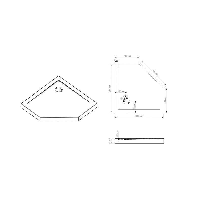 Ten pięciokątny brodzik pasuje wyłącznie do kabiny o wymiarach 90 na 90 cm, co sprawia, że jest doskonałym wyborem do narożnych przestrzeni.