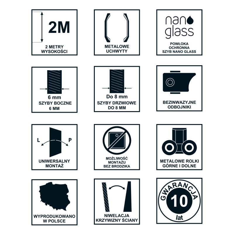 Drzwi charakteryzują się solidną konstrukcją, w której niektóre parametry pozostają stałe dla zapewnienia najwyższej jakości. Wysokość produktu wynosi 200 cm, a grubość szyb to 6 mm dla bocznych elementów i 8 mm dla drzwi. Każdy element drzwi wykonany jest z najwyższej klasy materiałów, takich jak wytrzymałe metalowe rolki i uchwyty, które gwarantują płynność działania i trwałość na lata.