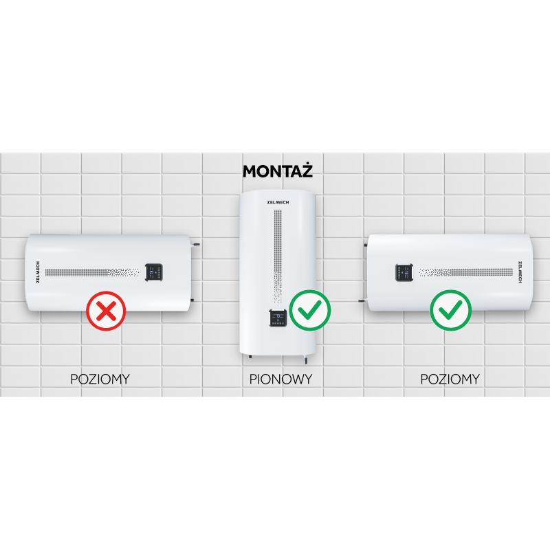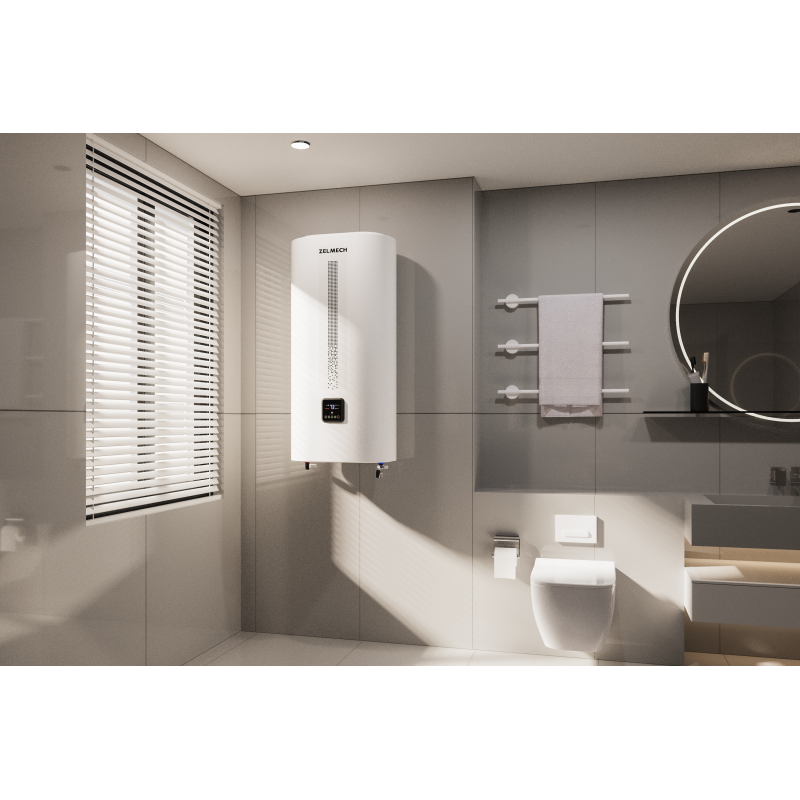 Bojler MATRIX marki Zelmech o pojemności 80 litrów to propozycja stworzona z myślą o rodzinach oraz użytkownikach, którzy oczekują maksymalnego komfortu, niezawodności i nowoczesnej estetyki. Eleganckie, matowe białe wykończenie w połączeniu z subtelnym dekorem sprawia, że urządzenie doskonale wpisuje się w stylistykę współczesnych łazienek, jednocześnie pozostając dyskretne i ponadczasowe. Smukła konstrukcja typu slim pozwala na łatwe dopasowanie bojlera nawet w ograniczonej przestrzeni, a możliwość montażu zarówno w pionie, jak i w poziomie daje pełną swobodę aranżacyjną.