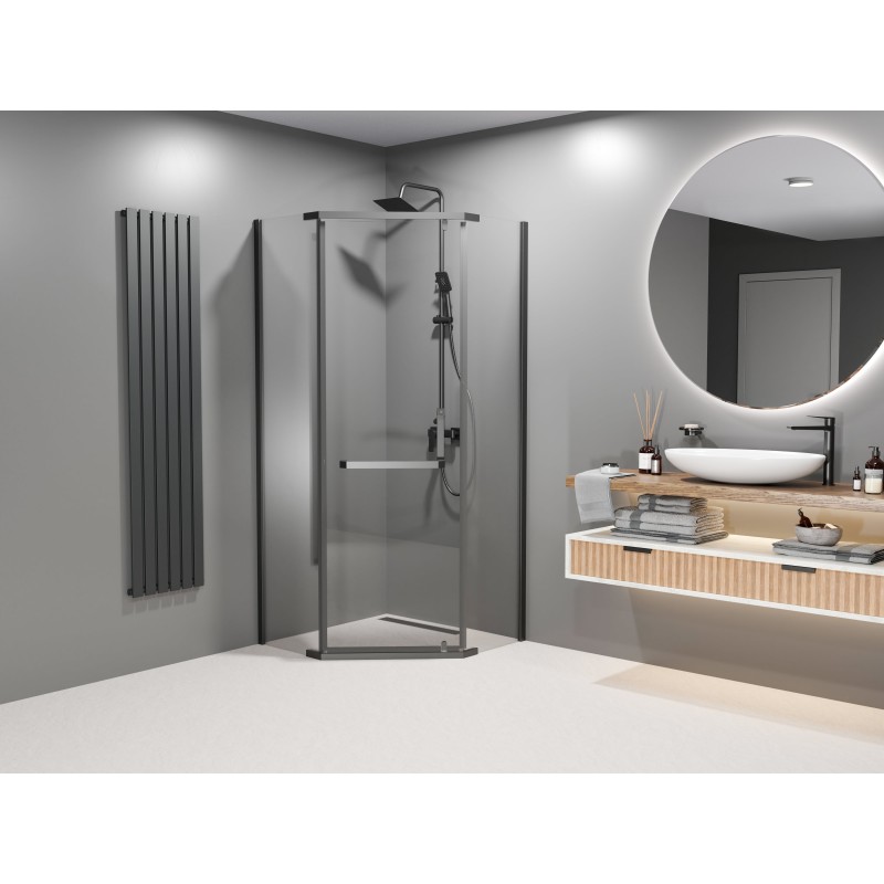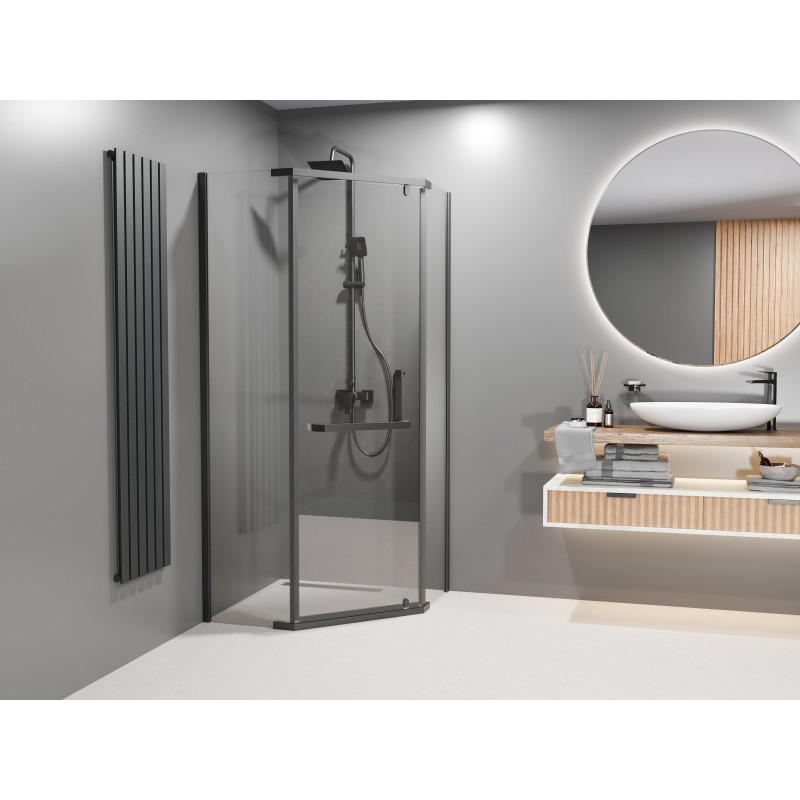 Kabina DIAMOND 80×80 została zaprojektowana w pięciokątnym kształcie, który pozwala maksymalnie wykorzystać przestrzeń, szczególnie w mniejszych i średnich łazienkach. Czarne profile nadają konstrukcji elegancki, industrialny charakter i doskonale komponują się z aranżacjami nowoczesnymi oraz loftowymi. Zastosowane grube szkło hartowane cechuje się wysoką odpornością na uszkodzenia mechaniczne oraz intensywne, codzienne użytkowanie. Transparentne szyby optycznie powiększają przestrzeń, nadając łazience lekkości i zapewniając lepsze doświetlenie strefy prysznicowej. Kabina łączy estetykę z funkcjonalnością, zachowując przy tym nowoczesny wygląd.