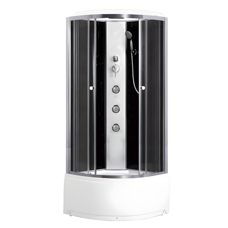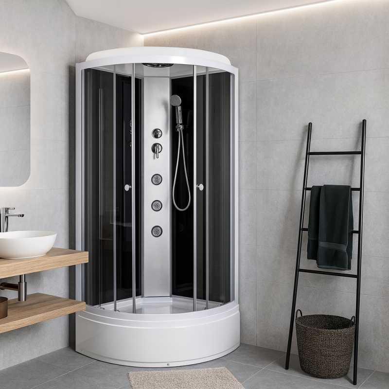 Specyfikacja:✅Producent: Durasan ✅Model: LOONA HYDRO WT-90 ✅Kształt: półokrągły ✅Rozmiar: 90x90 cm ✅Wysokość całkowita: 210 cm ✅Kolor szyb przednich: transparentne ✅Kolor szyb tylnych: czarne ✅Grubość szkła: 4 mm ✅Profile: aluminiowe, satyna ✅Szkło hartowane ✅Drzwi przesuwne na rolkach ✅3 dysze do hydromasażu ✅Wyposażenie: słuchawka z wężem, deszczownica, szklana półka ✅Wysoki, akrylowy brodzik w zestawie |